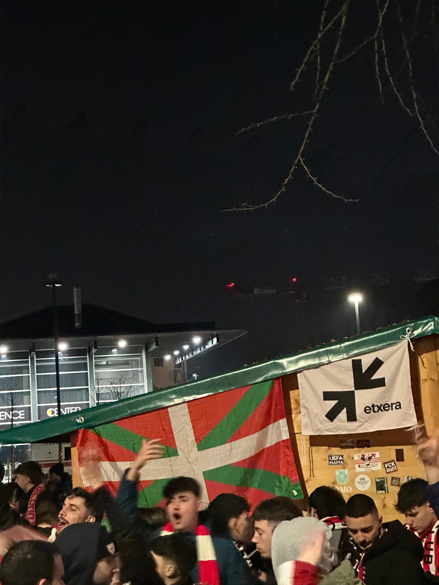 Non dovrebbero esserci problemi tra le tifoserie, dato che le società e il comune hanno preso parte a delle iniziative congiunte di amicizia, come il piantamento della quercia simbolo della libertà basca (il Gernikako Arbola) e lo svolgimento di una partita di calcio camminato, organizzata dagli Italiako Lehoiak, la numerosa peña italiana dell’Athletic. In ogni caso, da buon italiano in trasferta, occulto la sciarpa biancorossa che porto al collo. Mi accolgo ben presto che il clima è sereno, con tanti tifosi athletizales che passeggiano fieri con le loro magliette e drappi biancorossi.